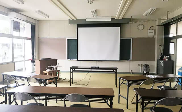 座学講習では、スクリーンを使用してフライトに必要な様々な知識を学びます。