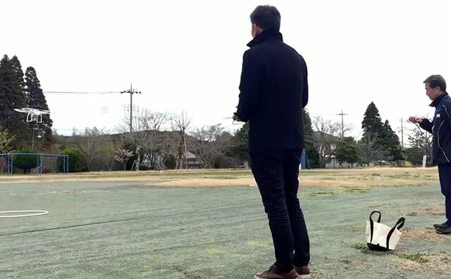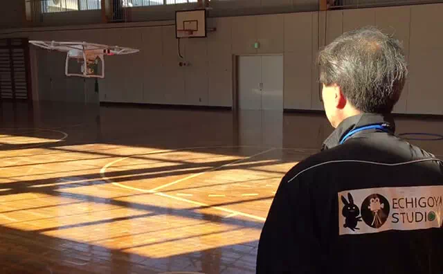 実際にドローンを操縦する実技講習は、まずは体育館で風や天候に影響されない中での練習です。