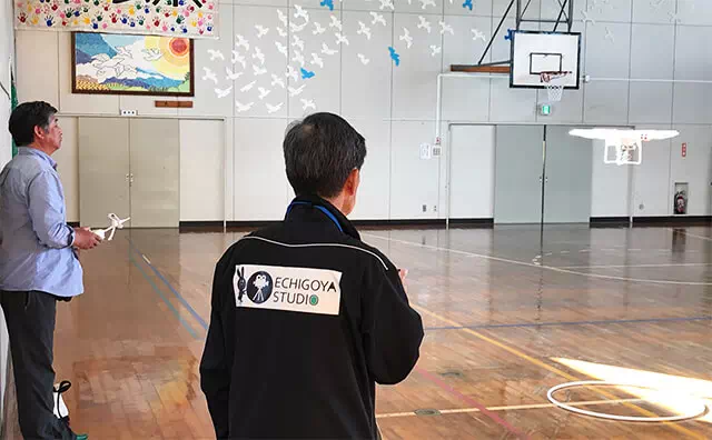 体育館で室内実技講習です。ドローンはプロペラを回して揚力を得るため、独特な感覚と操縦方法を身に着けます。