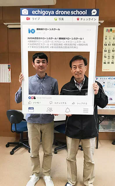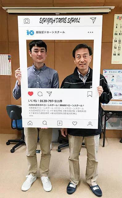 パネルで記念写真!越後屋ドローンスクールオリジナルのパネルがありますので、ぜひご利用ください!