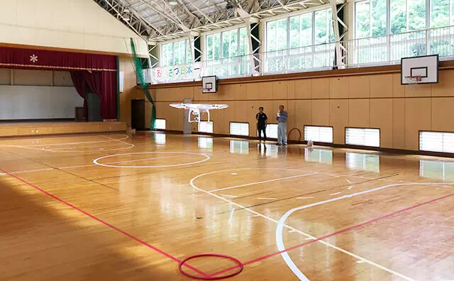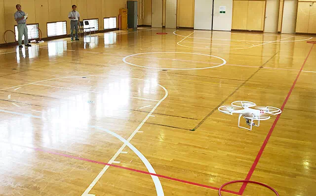 体育館でテストに向けて練習です。GPSの届きづらい屋内での飛行は少し難しいようです。