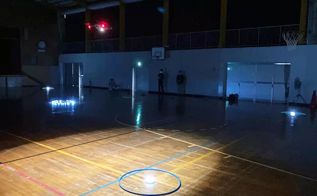 夜間飛行訓練では、体育館内を暗くして夜の環境を作り飛行訓練をしていきます。