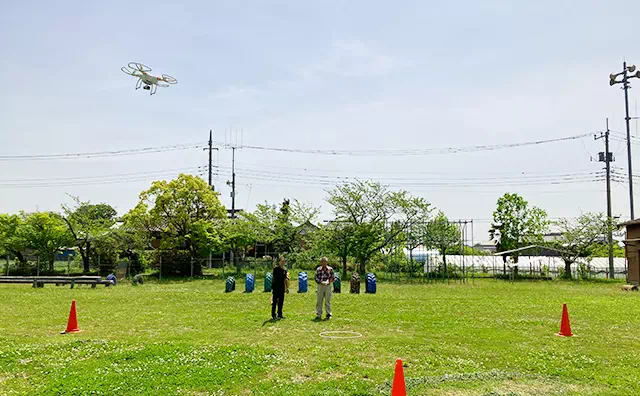 はじめに実技講習を行いました。この日は風が強めに吹いていたので対処法を助言して ドローンが風に流されないように飛行させました。