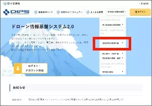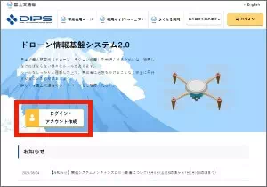 前述にも記載の通り、技能証明申請者番号の発行は国土交通省「DIPS(ドローン情報基盤システム)」から行います。「ログイン・アカウント作成」ボタンを押して、ログイン画面へお進みください。